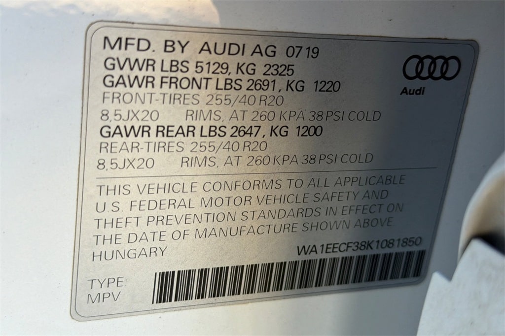 20" Wheel Package, 8-Way Power Driver & Passenger Seat, Aluminum Spectrum Inlays, Ambient LED Interior Lighting, Anti-Theft Alarm System w/Motion Sensor, Audi Advanced Key, Audi Parking System Plus, Audi Phone Box w/Wireless Charging, Audi Side Assist, Auto-Dimming Rear-View Mirror w/Compass, Convenience Package, Full LED Headlights w/Unique DRL Signature, HomeLink Garage Door Opener, Premium Plus Package, Wheels: 20" x 8.5" 5-Twin-Spoke Module Design.