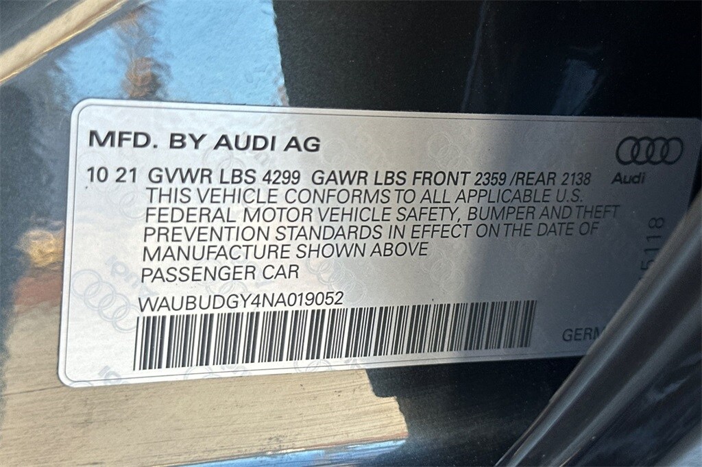 18" Wheel Package, Adaptive Cruise Assist w/Lane Guidance, Audi Phone Box Light w/Wireless Charging Pad, Black Exterior Trim, Black Optic Sport Package, Convenience Package, Garage Door Opener (HomeLink), LED Headlights w/DRL Signature, Premium Plus Package, Sport Suspension (-15 mm), Wheels: 18" 5-Y-Spoke Design.